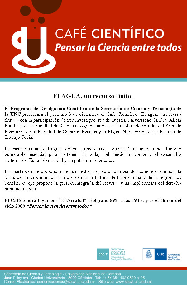 El Programa de Divulgación Científica de la Secretaría de Ciencia y Tecnología de la UNC presentará el próximo 3 de diciembre el Café Científico “El agua, un recurso finito”, con la participación de tres investigadores de nuestra Universidad: la Dra. Alicia Barchuk, de la Facultad de Ciencias Agropecuarias; el Dr. Marcelo García, del Área de Ingeniería de la Facultad de Ciencias Exactas; y la Mgter. Nora Britos, de la Escuela de Trabajo Social.