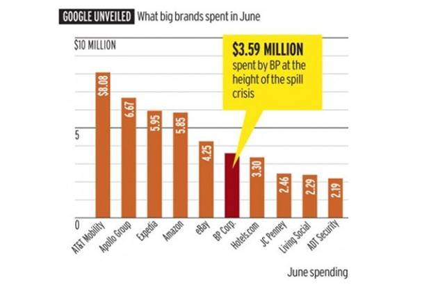 El dinero permitió que BP subiera al nivel más alto de las apariciones en resultados de búsquedas, un sector encabezado por Expedia, que gastó al menos 5,9 millones de dólares ese mes, seguido por Amazon con 5,8 millones de dólares y el sitio de subastas eBay con 4,2 millones de dólares.