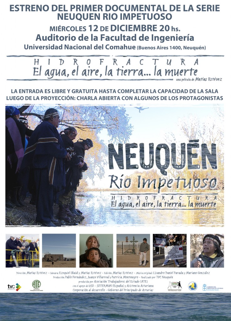 El director Matías Estevez ha terminado la primera entrega de la serie de documentales “Neuquén, Río Impetuoso”, centrada en las problemáticas asociadas a las industrias extractivas y la conflictividad social que estas actividades traen aparejadas. Este primer trabajo aborda el tema de los hidrocarburos no convencionales. El hallazgo en territorio neuquino de una importante cuenca gasífera que se podría explotar con el método de la fractura hidráulica ha sido anunciado con mucho entusiasmo desde los gobiernos nacional y provincial y el sector industrial vinculado a esta actividad, pero el hecho de que esta tecnología tan novedosa ya ha causado graves impactos en otras zonas hidrocarburíferas ha despertado la preocupación de ambientalistas, comunidades indígenas y especialistas en temas energéticos. Con “Hidrofractura, el agua, el aire, la tierra… la muerte” se visibilizan las voces que cuestionan esta nueva industria extractiva, acalladas en medio de la algarabía de empresas y gobiernos por el descubrimiento de potenciales recursos millonarios. Juristas, ingenieros, trabajadores de certificación de normas ambientales, representantes de las comunidades indígenas de los territorios afectados por esta nueva explotación, plantean sus temores y sus objeciones ante los riesgos que la fractura hidráulica plantea para el futuro de nuestra provincia amenazando la disponibilidad de agua dulce por la enorme demanda de ese recurso para la operación de los pozos no convencionales y por el peligro de contaminación irreversible de los acuíferos subterráneos.