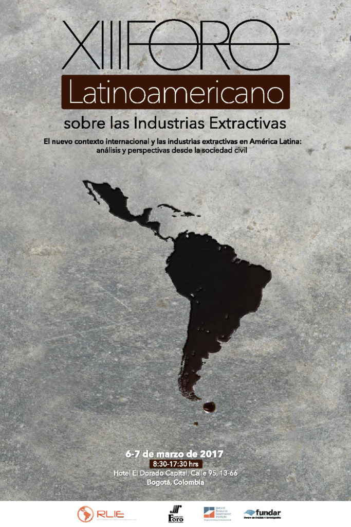 El próximo 6 y 7 de marzo de 2017 tendrá lugar en Bogotá, Colombia, el nuevo Foro Público de la RLIE: XIII Foro Latinoamericano sobre las Industrias Extractivas – El nuevo contexto internacional y las industrias extractrivas en América Latina: análisis y perspectivas desde la sociedad civil.