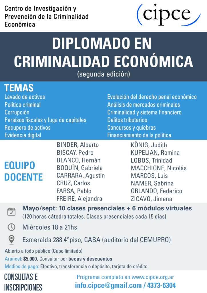 El Diplomado celebra este año su segunda edición. Con esta actividad, dictada en modalidad presencial (CABA) y virtual durante 5 meses, buscamos generar un espacio de capacitación de la mano de un equipo docente de primera línea, para abordar distintos temas vinculados al fenómeno de la delincuencia económica: lavado de dinero, política criminal, evasión de impuestos, corrupción, recupero de activos, entre otros. [Ver/Descargar Programa del Diplomado]
