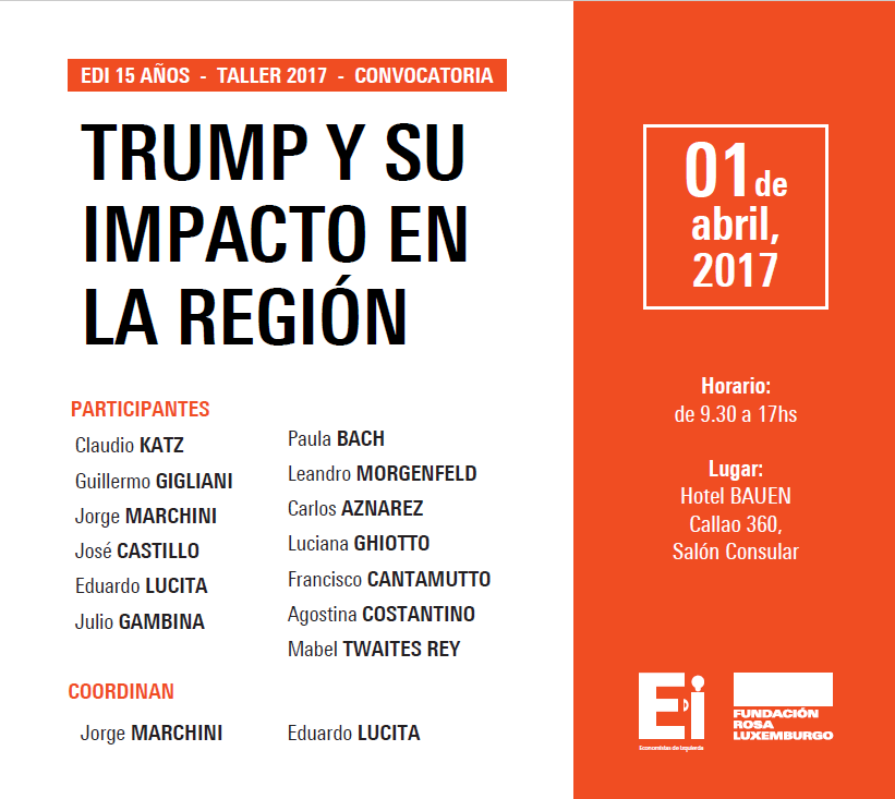 Desde que Economistas de Izquierda hiciera su presentación en el movimiento asambleario del 2002, los talleres anuales que año a año organizamos han buscado interpretaciones y respuestas en el marco de un amplio abanico de las ideas de izquierda en el país, pero nunca en estos quince años nos vimos confrontados a una realidad internacional como la que ha provocado la asunción de Donald Trump a la presidencia de los EEUU.