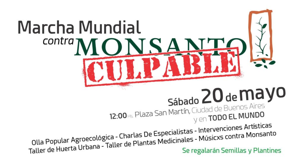 Este 20 de Mayo, en mas de 600 ciudades de todo el mundo se desarrollará una nueva Marcha Mundial contra Monsanto, la corporación recientemente fusionada con Bayer, declarada culpable del delito de ECOCIDIO, de afectar el derecho a un ambiente saludable, a la salud, la alimentación y a la libertad para la investigación científica, por un Tribunal Internacional integrado por 5 juristas de distintas partes del mundo en un fallo que si bien no tiene validez jurídica, sus conclusiones podrán ser usadas en juicios posteriores.