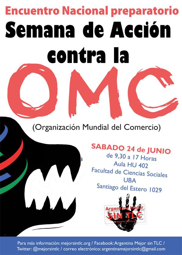 Es fundamental que expresemos nuestro profundo rechazo a esta institución. Tenemos que darle una “mal-venida” a las delegaciones de representantes de un modelo económico que tanta pobreza y destrucción está generando a nivel mundial. Con el objetivo de planificar la Semana de Acción en Diciembre y dibujar una hoja de ruta de actividades hasta la llegada de la OMC, desde la Asamblea Argentina Mejor sin TLC invitamos a todas las organizaciones y movimientos, agrupaciones, partidos y articulaciones de todas las provincias al Encuentro Nacional de Planificación contra la OMC en Argentina, que tendrá lugar el sábado 24 de Junio a partir de las 9.30 en el Aula HU 402 de la Facultad de Ciencias Sociales (UBA) en Santiago del Estero 1029, CABA.