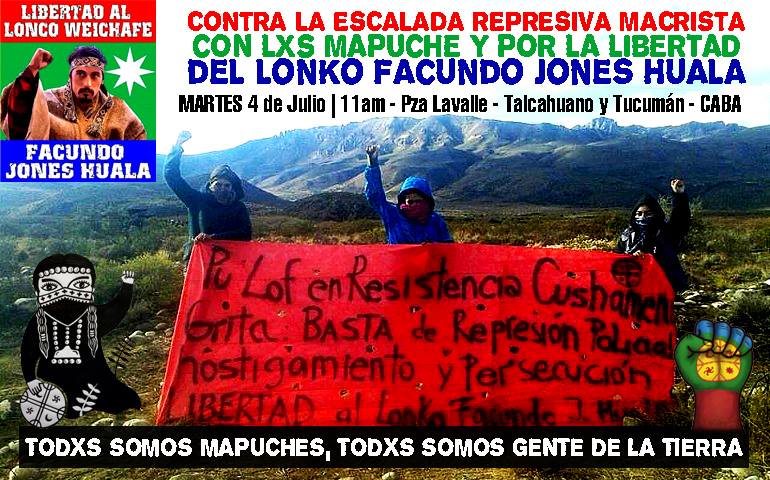 Nos autoconvocamos el próximo Martes 4 de Julio desde las 11.00 horas en Plaza Lavalle (Talcahuano y Tucuman) para repudiar masivamente la política represiva del Estado Argentino, y solidarizarnos con pu lamien (todas las hermanas) y pu peñi (todos los hermanos) en resistencia por la LIBERTAD INMEDIATA DE FACUNDO JONES HUALA.