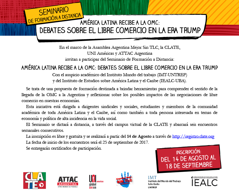 En el marco de la Asamblea Argentina Mejor Sin TLC, la CLATE, UNI Américas y ATTAC Argentina invitan a participar de un nuevo seminario de formación.