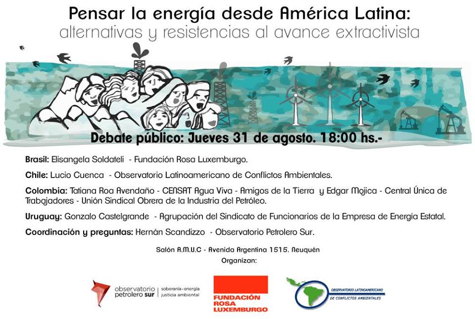 El próximo 31 de agosto se realizará el debate público “Pensar la energía desde América Latina: alternativas y resistencias al avance extractivista”, organizado por el Observatorio Petrolero Sur, la Fundación Rosa Luxemburgo y el Observatorio Latinoamericano de Conflictos Ambientales, en el marco del Taller “Territorio y Maldesarrollo”.