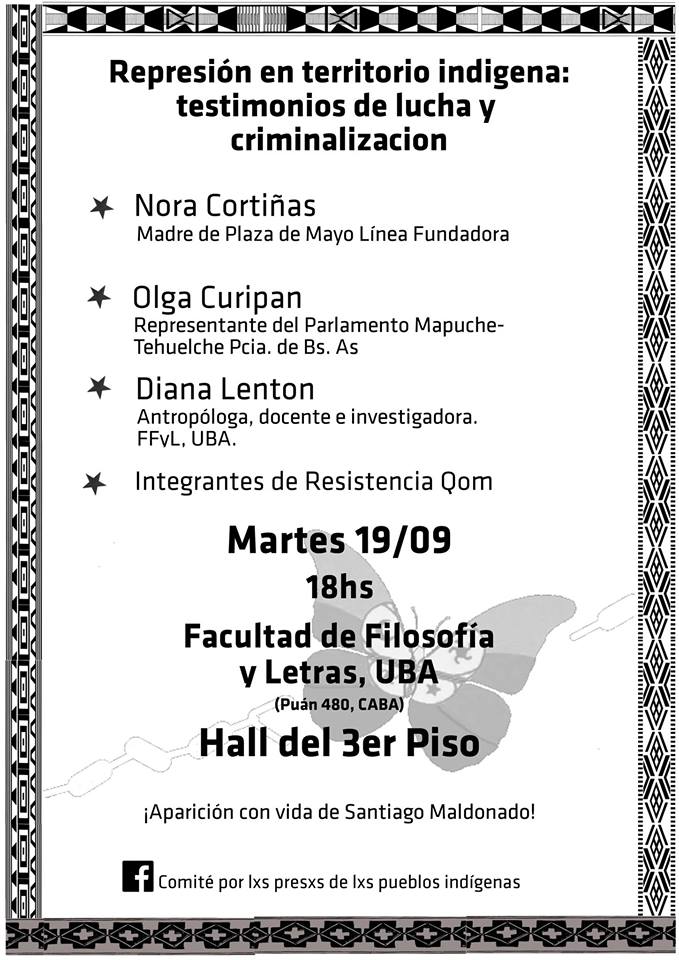 Charla “Represión en el territorio indígena: testimonios de lucha y criminalización” y por la aparición de Santiago Maldonado organizada por el Comité por lxs Presxs de los Pueblos Indígenas.