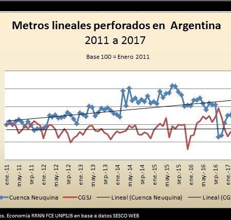 En un contexto de baja en el precio internacional del petróleo y de cambio de paradigma energético (Hacia energía renovables) los presupuestos de inversión han disminuido desde el 3er. trimestre de 2.015 y ha comenzado una fase competitiva de la misma entre HCNC e hidrocarburos convencionales (HCC) y por ende entre la CNQN y la Cuenca del Golfo San Jorge (CGSJ), en el gráfico siguiente podemos apreciar la tendencia creciente en la CNQN y de leve baja en la CGSJ de los metros lineales perforados en todo tipo de pozos.
