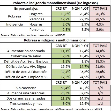 Una foto presente tanto de la pobreza unidimensional o de ingresos nos entrega una menor pobreza e indigencia, tanto en hogares o personas,  en CRD/RT que en en NQN/PLOTIER donde de las variables analizadas solo registra menores problemas en el acceso a la vivienda y una distribución del ingreso mas igualitaria.