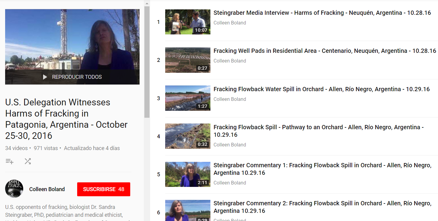Colleen Boland ha publicado una lista en Youtube “U.S. Delegation Witnesses Harms of Fracking in Patagonia, Argentina – October 25-30, 2016” donde se pueden ver comentarios y entrevistas realizadas por la Doctora Steingraber en la localidad de Allen en Río Negro, en Loma La Lata, Añelo y Vista Alegre en Neuquén.