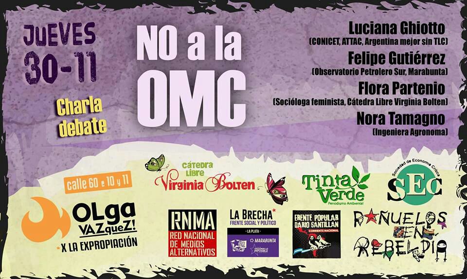 Del 10 al 13 de diciembre se realizará en Argentina la XI Conferencia Ministerial de la Organización Mundial de Comercio (OMC), organismo internacional que busca promover el libre comercio entre países, impulsando la apertura de los mercados de países periféricos y facilitando negocios para empresas trasnacionales.