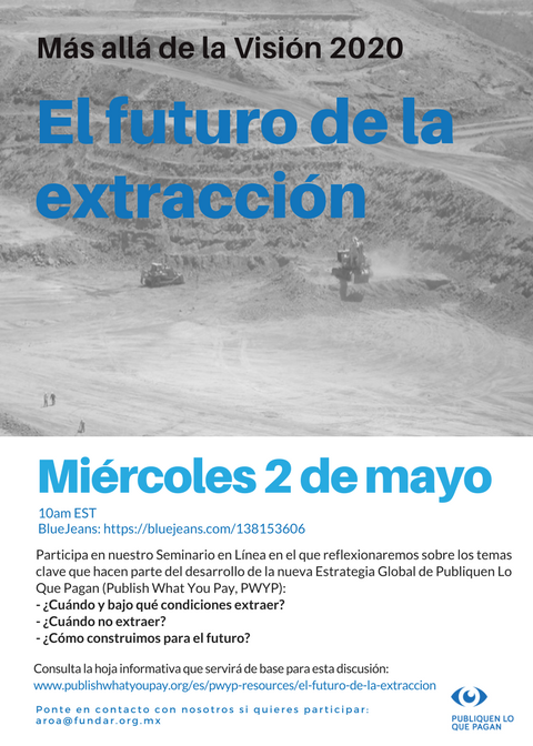 La Red Latinoamericana sobre Industrias Extractivas (RLIE) y la coalición global Publiquen Lo Que Pagan (PWYP, por sus siglas en inglés) invitan al seminario en línea “Extraer o no Extraer”. En el mismo se plantearán perspectivas desde la región latinoamericana en relación a la discusión sobre sobre si se debe o no continuar con la explotación de minerales e hidrocarburos o si, por el contrario, debemos abandonar estas actividades y promover alternativas a las mismas dados las consecuencias negativas que tienen sobre la población y sus derechos humanos, el ambiente y el clima. También se buscará responder a la pregunta sobre cuál es el rol de la sociedad civil regional y global en esta transición.