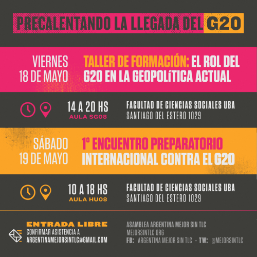 El viernes 18/5 estaremos de 14 a 19.00 en el Aula HU08 de la Facultad de Ciencias Sociales, UBA, en Santiago del Estero con el Taller de Formación “El rol del G20 en la geopolítica actual”. El śabado 19/5 lxs esperamos desde las 10.00 en SG 08, también en Sociales para el 1er Encuentro Preparatorio contra el G20! NO SE LO PIERDAN!
