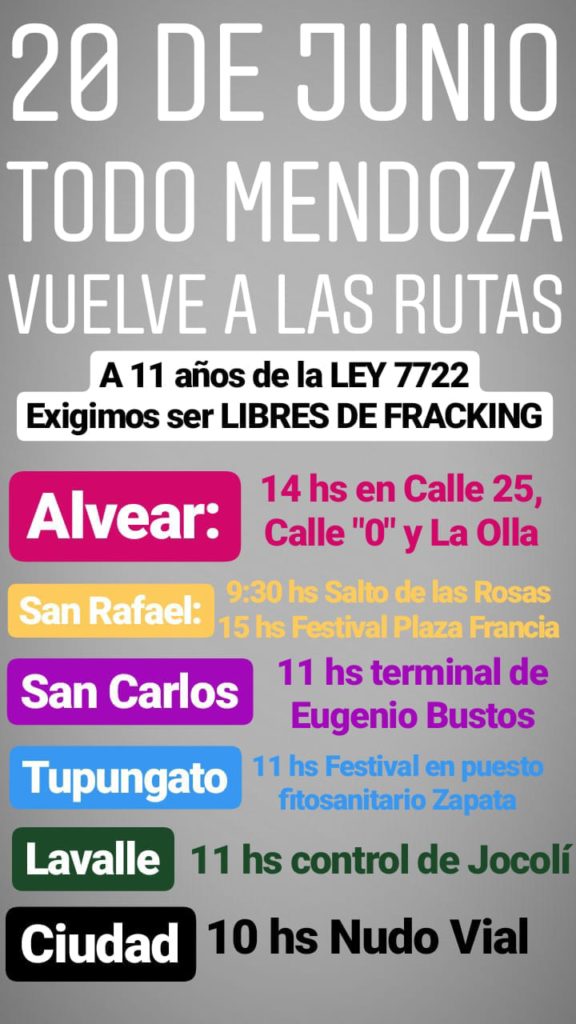 Comunicados 20 de Junio, todo Mendoza vuelve a las rutas Manifestaciones en San Rafael, Alvear, San Carlos, Lavalle, Tupungato y Mendoza Capital. Sumate! Navegación de entradas arrow-leftPrevioPrevio14/06 | Bariloche: Energía para qué, para quiénes y para cuántosarrow-rightSiguienteSiguienteRelator Especial de la ONU sobre defensores de los derechos humanos insta a actuar a EEUU