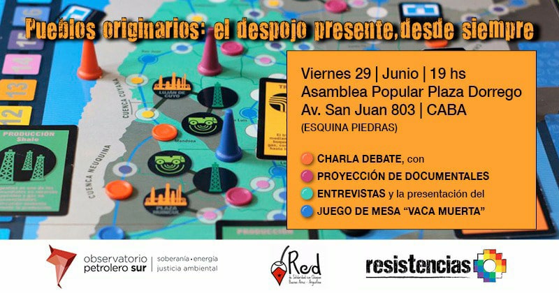 El viernes 29 vamos a estar presentando nuestro documental Territorio Crudo, y hablando de Vaca Muerta como caso testigo del despojo territorial, junto con la presentación de otros documentales y el juego de mesa “Vaca Muerta”, en esta actividad organizada por la Red de Solidaridad con Chiapas y Resistencias.