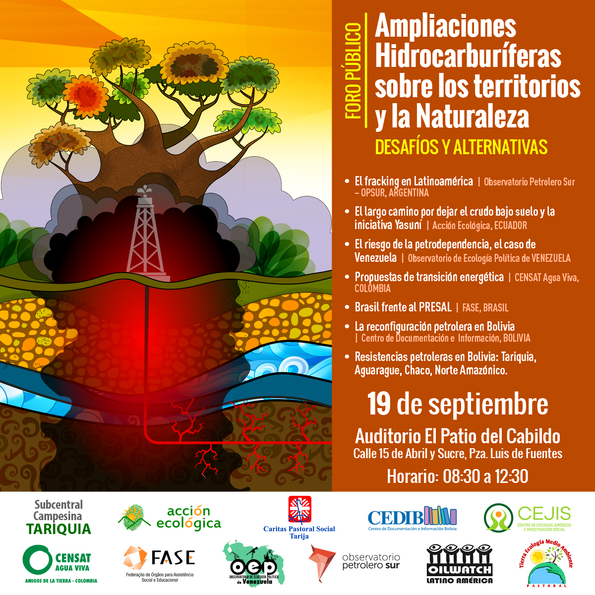 El 19 de septiembre se realizará en Tarija del foro público Ampliaciones hidrocarburíferas sobre territorios y Naturaleza, convocado el CEDIB y otras organizaciones de Bolivia. Desde el OPSur y la red Oilwatch Latinoamérica nos sumamos a la iniciativa de las compañeras y compañeros y en ese ámbito compartiremos las luchas de nuestros territorios. Les esperamos!!!