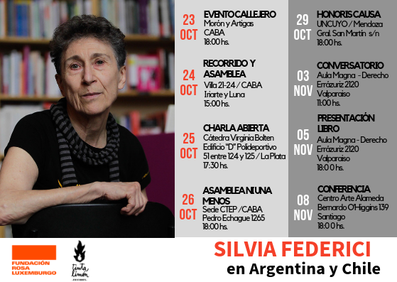 En conjunto con Tinta Limón Ediciones y distintas organizaciones de Argentina y Chile, la Fundación Rosa Luxemburgo impulsa la gira de Silvia Federici con el propósito de extender estas ideas y seguir poniendo en relieve lo sustancial que resulta la construcción de un feminismo popular y de clase en tiempos de una nueva embestida neoliberal y por tanto de profundos retrocesos democráticos.