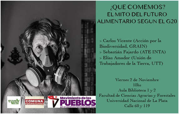 Comunicados 2/11 | La Plata: ¡Qué comemos? El mito del futuro alimentario según el G20 Navegación de entradas arrow-leftPrevioPrevio30/10 | Lavalle: por una ordenanza que prohíba el fracking y que proteja el aguaarrow-rightSiguienteSiguienteSe viene la Semana de Acción Fuera G20 FMI