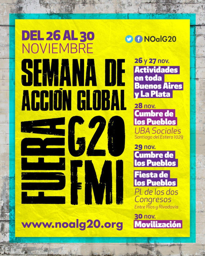 HOY arranca la Semana de Acción Global Fuera G20 FMI, que durará hasta el 30 de noviembre, y comprende un importante número de actividades en la Ciudad de Buenos Aires y La Plata. Parte de dicha Semana será además una Cumbre de los Pueblos el miércoles, 28 de Noviembre de 10 a 21.00 en la Facultad de Ciencias Sociales de la UBA (Santiago del Estero 1029) y el jueves, 29 de Noviembre desde las 10.00 en la Plaza de los dos Congresos (Rivadavia y Callao) que concluirá con una gran Fiesta de los Pueblos, en la que nos acompañan Sudor Marika, Kumbia Queers, Arbolito y Daniel Devita. La agenda completa de actividades la pueden consultar haciendo click aquí.