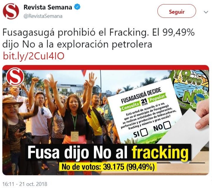 No obstante lo anterior, el fracking está nuevamente en el centro del debate en Colombia. A pesar de la decisión democrática tomada en Fusagasugá, que se suma a otras experiencias similares en Boyacá y Tolima, el presidente de Ecopetrol, Felipe Bayón, anunció la realización de una prueba piloto en 2019 con el fin de evaluar junto con “la academia, las comunidades, los ambientalistas, entre otros sectores, los impactos y beneficios que traería al país esta técnica de explotación de hidrocarburos”. El plan piloto que se llevará a cabo en las inmediaciones de Barrancabermeja, en un área de 150 kilómetros por un lado y 60 kilómetros por otro, puede incluir otros siete departamentos además de Santander.