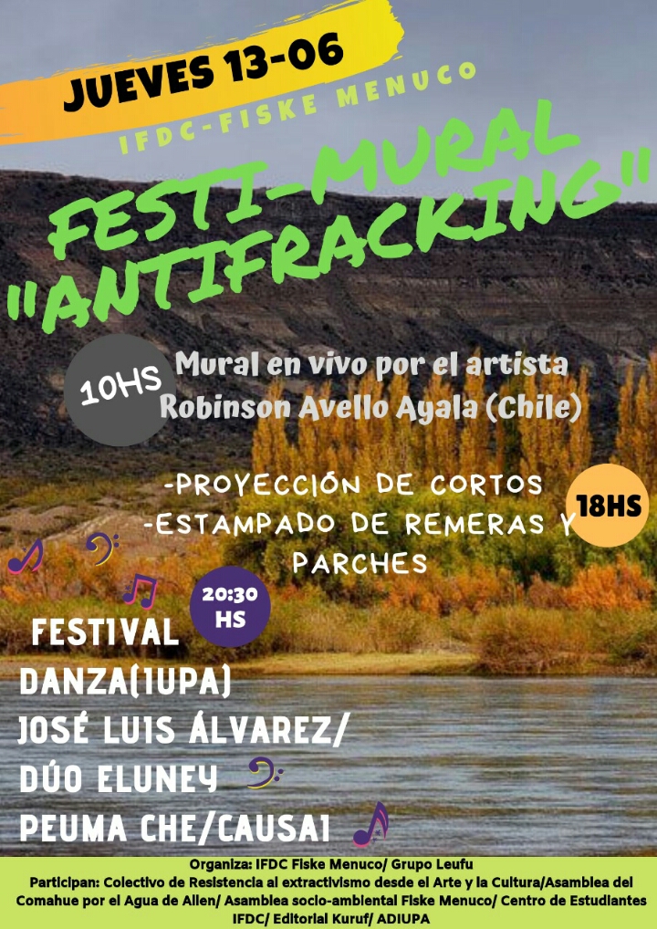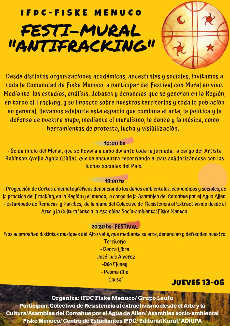 La jornada comenzará a las 10 hs con el mura a cargo del artista Robinson Avello Ayala (Chile). A las 18 hs hay una proyección de cortos cinematográficos que narran experiencias de impactos del fracking y una charla a cargo de la Asamblea del Comahue por el Agua Allen, además desde esa hora habrá un puesto de estampados de remeras y parches dónde realizarán un taller dictado parte del Colectivo de Resistencia al Extractivismo desde el Arte y la Cultura junto a la Asamblea Socio-ambiental Fiske Menuco. El festival musical y de danza comenzará a las 20.30 hs y tendrán como protagonistas al grupo Danza Libre, y los artistas José Luis Álvarez, Dúo Eluney, Peuma Che y Causai.