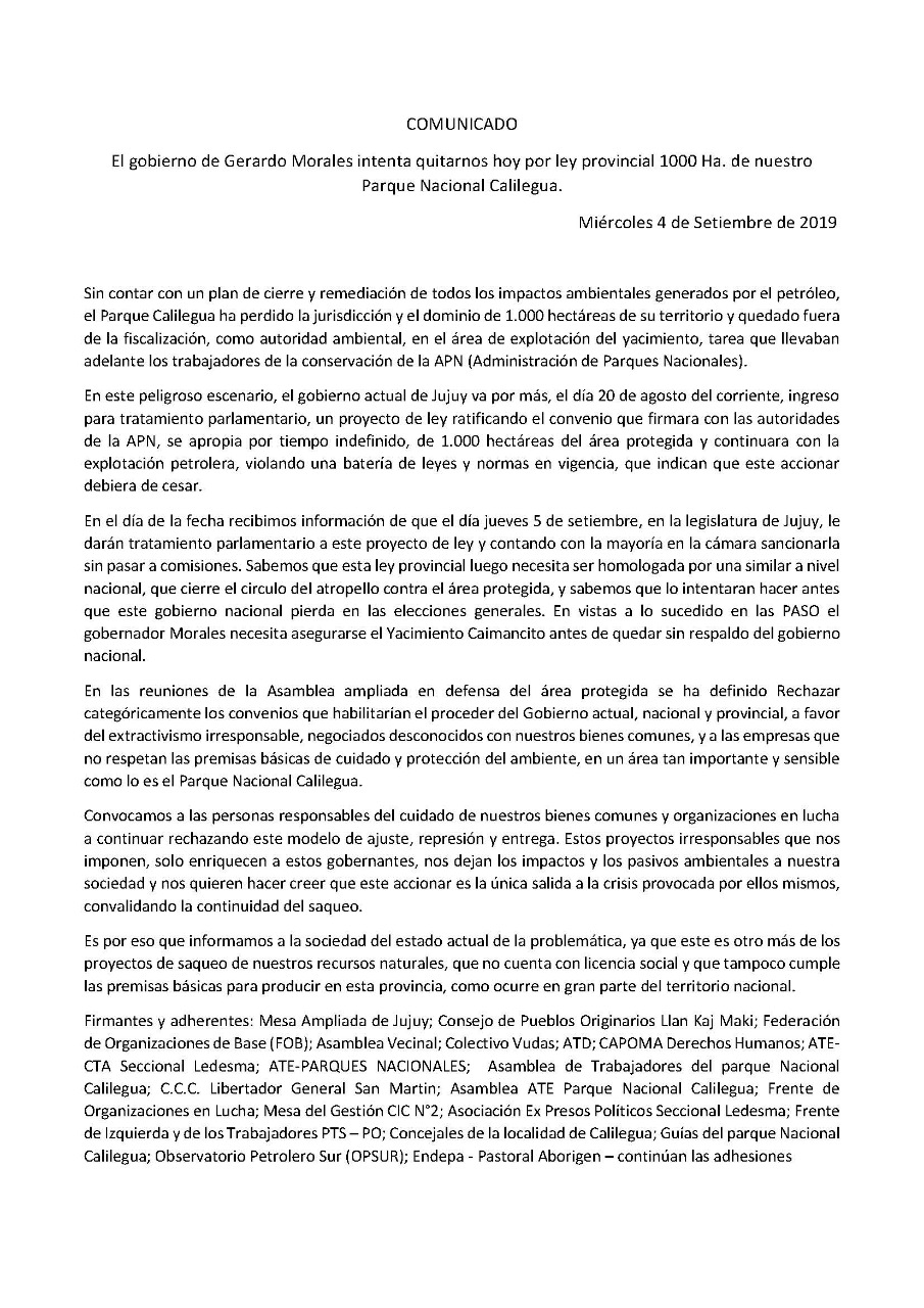 Comunicados El gobierno de Gerardo Morales intenta quitarnos mil hectáreas de nuestro Parque Nacional Navegación de entradas arrow-leftPrevioPrevioComodoro Rivadavia: Encapuchados atacaron un piquete de trabajadorxs de la educaciónarrow-rightSiguienteSiguienteSumate al webinar: ¿Qué hizo el gobierno de Mauricio Macri en el sector energético?