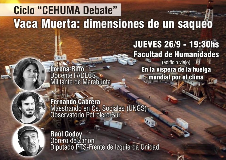 Este jueves 26/9, a las 19:30hs en el edificio viejo de la Facultad Humanidades, presentaremos el debate “Vaca Muerta: dimensiones de un saqueo”.