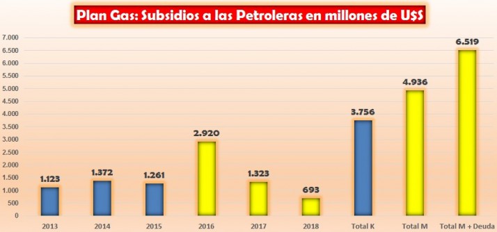 A ese panorama se le deben incorporar los 10.275 millones de dólares que el Estado nacional destinó entre 2013 y 2018 para las empresas privadas a través de los subsidios para la producción de gas natural extraído particularmente en Vaca Muerta. Aunque no fueron directamente entregados para la ampliación de las reservas, terminaron ayudando a las compañías petroleras en sus finanzas y para nada se tradujeron en mejoras sustanciales en los reservorios.