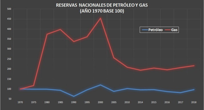 Para 2018 la Secretaría de Energía relevó 2.388 millones de barriles de petróleo, confirmando el aumento interanual de 18,4%; pero esa cantidad de reservas es 5,3% menor a los 2.524 millones de barriles contabilizados en 2010 cuando todavía no tenían ninguna incidencia los reservorios de Vaca Muerta. Si la comparación se efectúa con los 2.973 millones de barriles existentes en 2000, cuando se alcanzó el mayor nivel de los últimos 20 años, la retracción termina siendo del 19,6%.