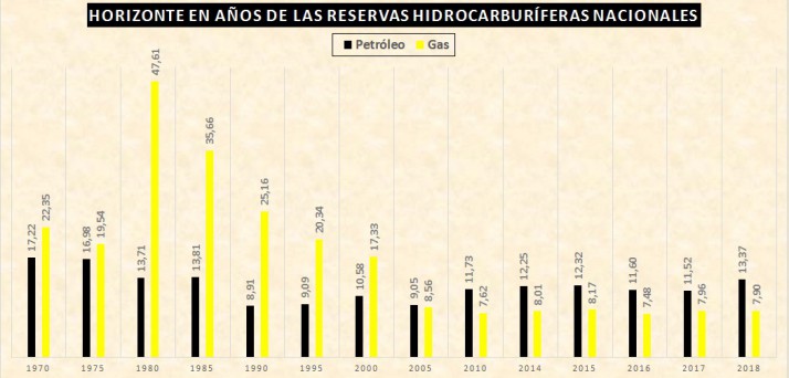En 2018 el horizonte (producción sobre reservas) del crudo nacional creció a 13,37 años y se transformó en el nivel más elevado en casi tres décadas; sin perder de vista que en 2000 se extrajeron 44,6 millones de barriles y el año pasado solamente 28,4 millones. Durante 2010 el horizonte era de 11,73 años y se mantuvo con variaciones menores a pesar del ingreso en escena de los yacimientos no convencionales.