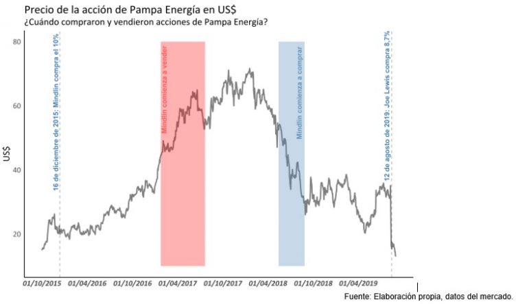 La última movida accionaria se produjo al día siguiente de las elecciones de agosto del corriente año. En el trascurso del mencionado día, el precio de la acción se desplomó a la mitad. En ese momento, el amigo personal de Macri, Joe Lewis, adquirió el 8,7% del paquete accionario de Pampa Energía. La compra fue realizada a través de dos sociedades: Braslyn Ltd (Bahamas) y Hidden Lake S.A. (Argentina). Si bien Lewis mantuvo participaciones accionarias desde la creación de Pampa Energía, se fue desprendiendo de las mismas con el transcurso del tiempo.