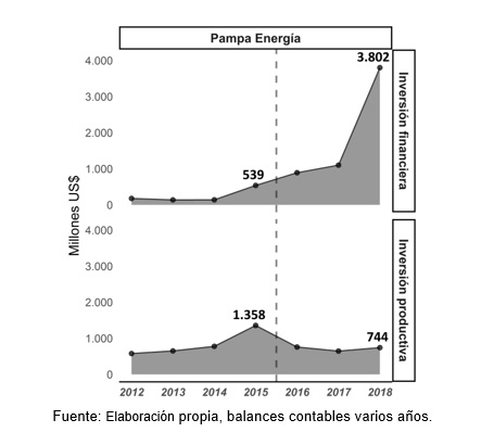 Tras el cambio de gobierno en el año 2015, el nuevo modelo económico priorizó las ganancias financieras por sobre las productivas. Pampa Energía no se encuentra ajena a esta vorágine financiera. Tras los “tarifazos”, la empresa comenzó a amasar ingentes ganancias. Sin embargo, estos recursos no fueron destinados a la inversión productiva para mejorar la calidad de servicio. En cambio, las inversiones financieras —principalmente en títulos públicos— aumentaron al mismo tiempo que retrocedieron las productivas. Para el año 2018, las inversiones financieras superaron varias veces a las productivas, como se aprecia en este gráfico: