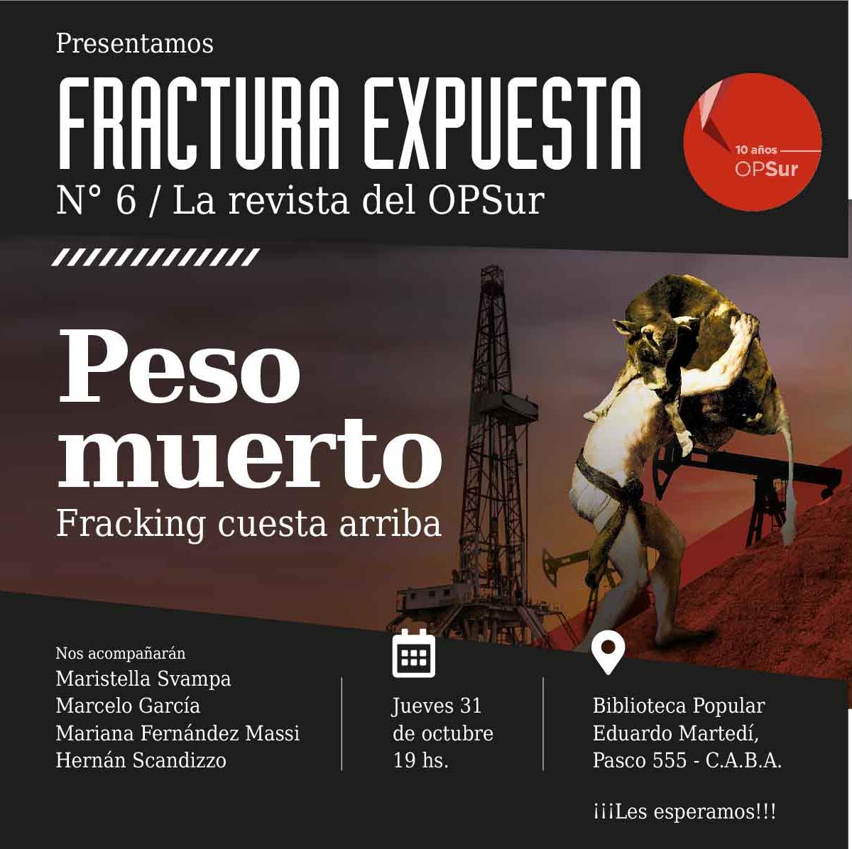 Peso Muerto. Fracking cuesta arriba es la imagen que resume esta sexta edición de Fractura Expuesta, la revista del OPSur. El consenso del fracking nos remite al mito de Sísifo, a esa condena al esfuerzo constante e inútil. A lo largo de los últimos años Vaca Muerta fue presentada como la gran promesa argentina y cuando se anuncia que el camino hacia la cima está despejado… la vaca vuelve a caer.