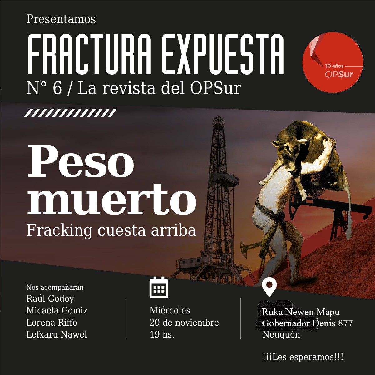 Peso Muerto. Fracking cuesta arriba es la imagen que resume la sexta edición de Fractura Expuesta, la revista del OPSur. El consenso del fracking nos remite al mito de Sísifo, a la condena al esfuerzo constante e inútil. A lo largo de los últimos años Vaca Muerta fue presentada como la gran promesa argentina y cuando se anuncia que el camino hacia la cima está despejado… la vaca vuelve a caer.
