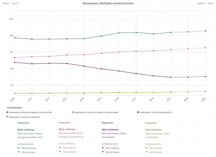 El desempleo seguirá creciendo de manera galopante en el contexto de nacional, así lo advierte al Organización Internacional del Trabajo (OIT). En el 2018 la cantidad de desempleados mundiales alcanzó los 185,8 millones de trabajadores y en el 2019 subió a 187,7 millones; para este para se proyectaron 190,3 millones de desocupados y para el 2021 la cifra ascendería a los 193,7 millones de personas. Pero los márgenes establecidos como techo y como piso para este 2021 serán de 234 y 162 millones de empleados sin trabajo; para el 2023 la OIT prevé que la desocupación abarque a casi 200 millones de personas en el mundo entero.