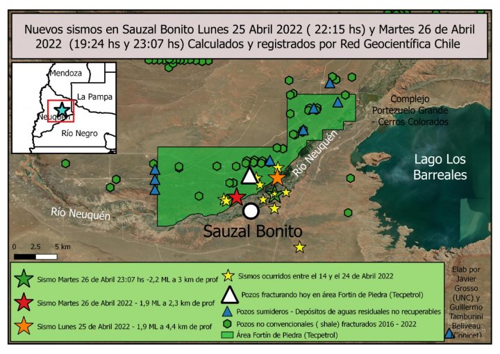 “Sauzal Bonito es el lugar del país con mayor sismicidad percibida y con los sismos más superficiales”, sostiene el geógrafo de la Universidad Nacional del Comahue, Javier Grosso, quien investiga desde hace años la relación de los sismos con la fractura hidráulica o fracking y la inyección de sus residuos en pozos sumideros. Los mapas del geógrafo apuntan a exhibir la concordancia en tiempo y espacio entre las áreas y momentos de mayor actividad hidrocarburífera y el epicentro de los sismos registrados.