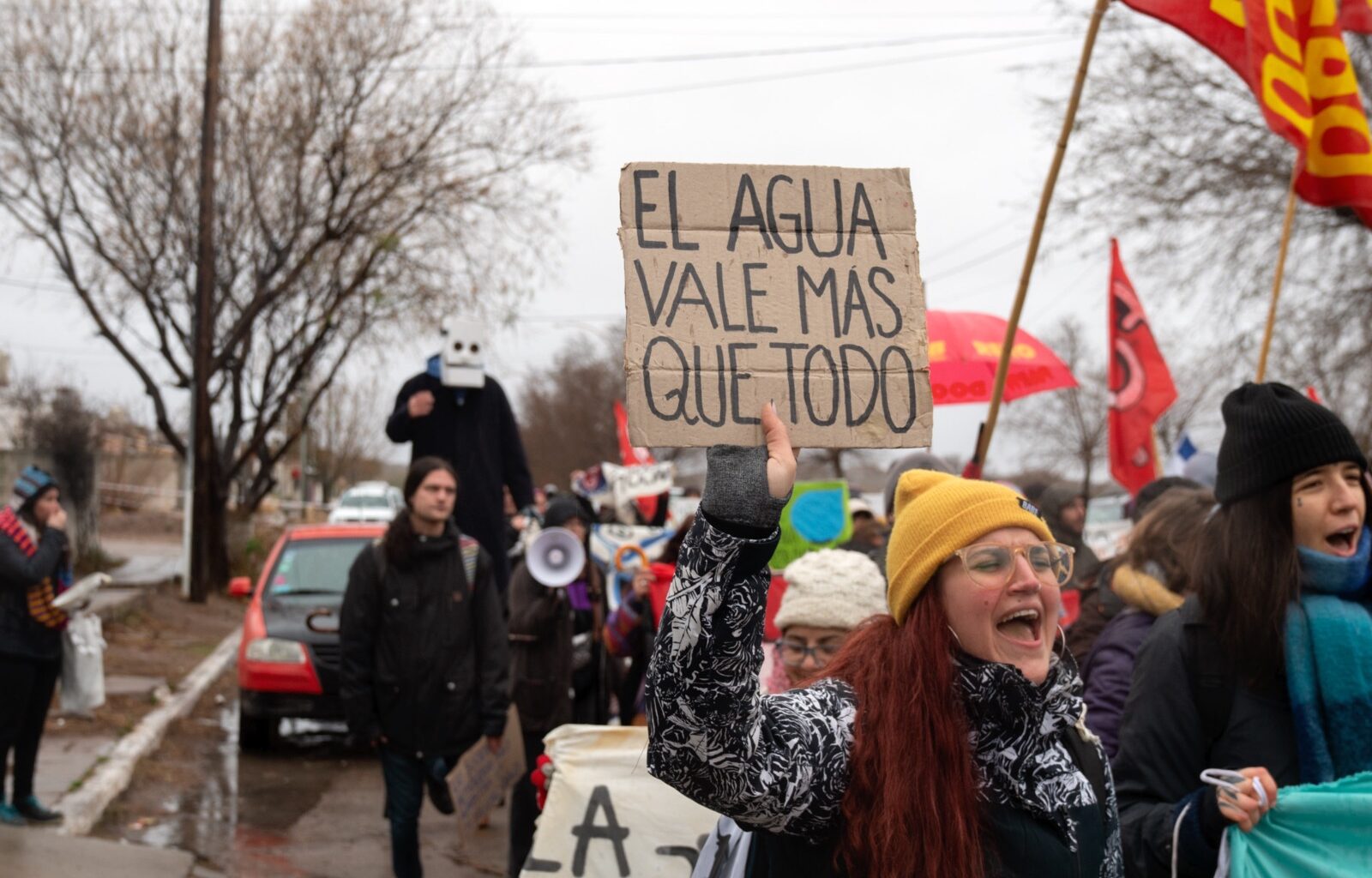 Cuando llueve mucho y el suelo está húmedo es como si lloviera dos veces. El agua que escurre de los paraguas y las camperas de las y los manifestantes se junta por capilaridad con la que sube por los pantalones. Ya casi nada está seco, y los pies flotan dentro de los zapatos. El clima y el tiempo se parecen al lugar donde se realiza la audiencia. El oleoducto tiene 600 kilómetros, atraviesa Río Negro y genera afectación en Neuquén y Chubut. La audiencia podría ser cualquier día, en muchas partes, pero es hoy. Un día de lluvia en Sierra Grande, un territorio donde vinieron a prometer lo que dicen los carteles.