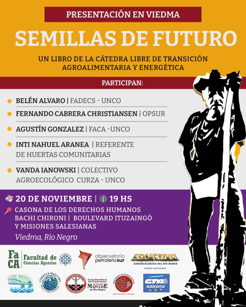 Este jueves 20 de noviembre se presenta en Viedma Semillas de futuro. Diálogos para la transición energética y agroalimentaria en Norpatagonia, la primera publicación de la Cátedra Libre de Transición Agroalimentaria y Energética de la Universidad Nacional del Comahue (UNCo). La actividad será a las 19 h en la Casona de los Derechos Humanos Bachi Chironi, en Boulevard Ituzaingó y Misiones Salesianas.