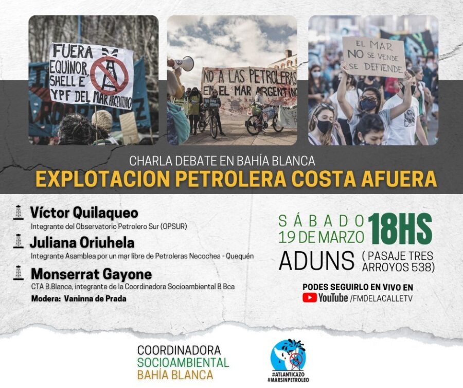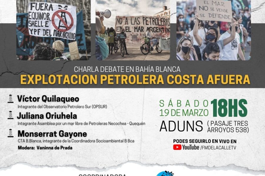 Aspectos socioambientales y económicos en juego por el proyecto para extender la actividad hidrocarburífera en el Atlántico. Con la participación de Víctor Quilaqueo, de OPSur. Sábado 19/3 | 18h Pasaje Tres Arroyos 538, Bahía Blanca En vivo: youtube.com/fmdelacalletv
